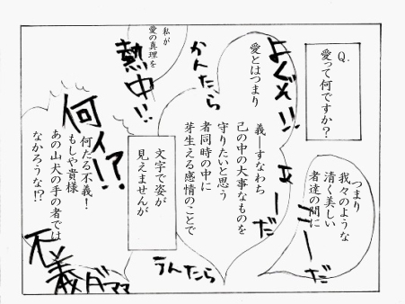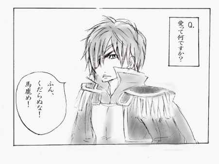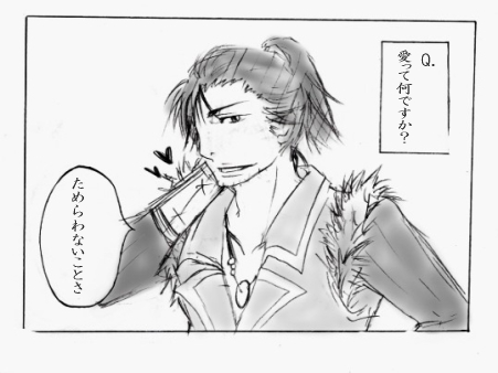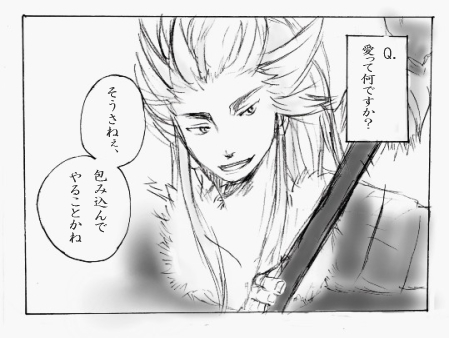 愛って何ですか? ということで、ありがち(?)なネタを。 ちなみに 孫市→1のセリフ通り。猪突猛進型(笑) 政宗→くだらないと言いつつ一番執着するタイプ 慶次→包容力 兼続→永遠と訳のわからないこと話しまくり みたいな感じです。イメジ。